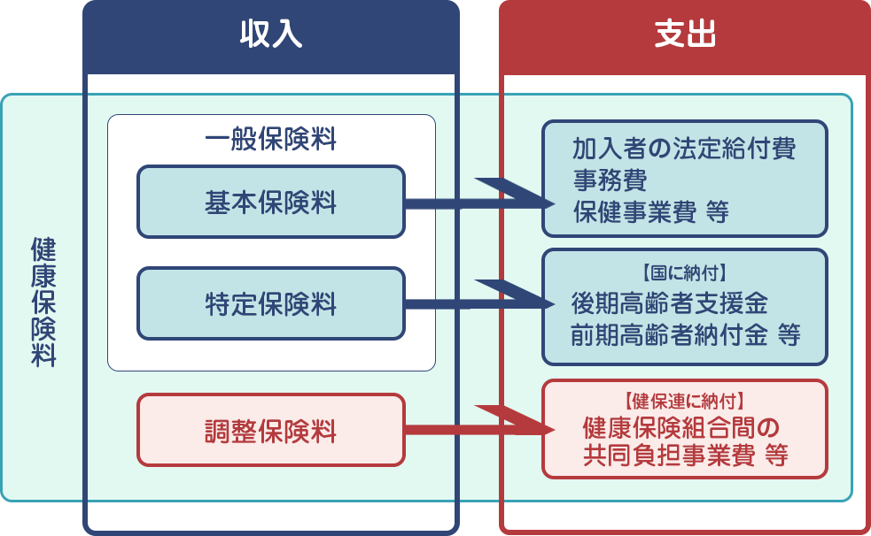 納められた健康保険料は、加入者のみなさんへの各種保険給付をはじめ保健事業等に使われる「基本保険料」、 高齢者医療制度等への支援金に使われる「特定保険料」、 健康保険組合間の高額医療費の共同負担事業等に使われる「調整保険料」などに充てられます。
